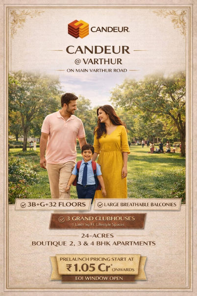 CANDEUR | VARTHUR EOI | Flat | 24 Acres | 10 Towers | 3B+G+32 UF | 2,3,4 BHK | 1165-2225 SqFt | ₹1.17 Cr | 10K/SqFt | BMRDA | EOI | RERA: Yes | Varthur